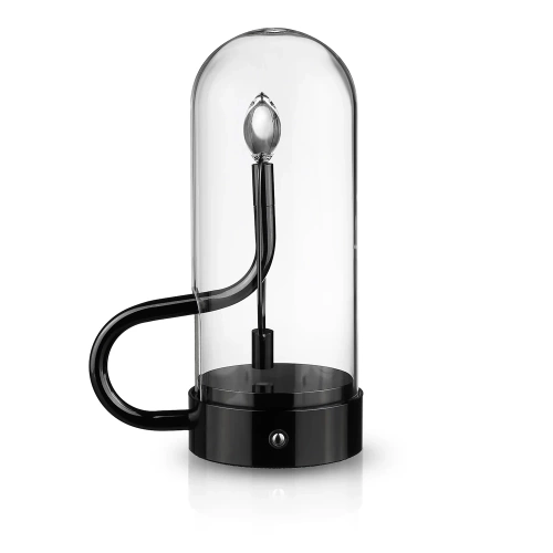 Die Lampe besitzt eine kleine Linse, die mit LED-Licht beleuchtet wird und sich an einer Metallschleife befindet. Sie erzeugt ein warmes, flackerndes Licht, das an eine Kerze erinnert. Im eingeschalteten Zustand stoßen zwei Magnete die Linse ab, sodass sie in leichten, konstanten Bewegungen schwingt und so einem unvorhersehbaren Rhythmus folgt.